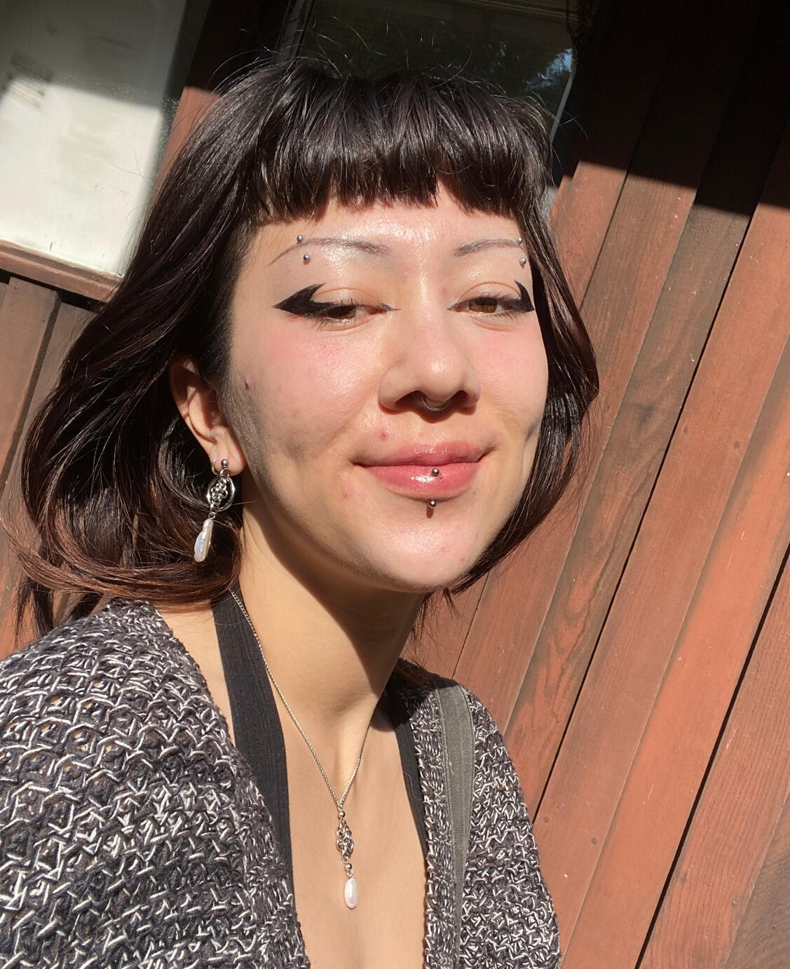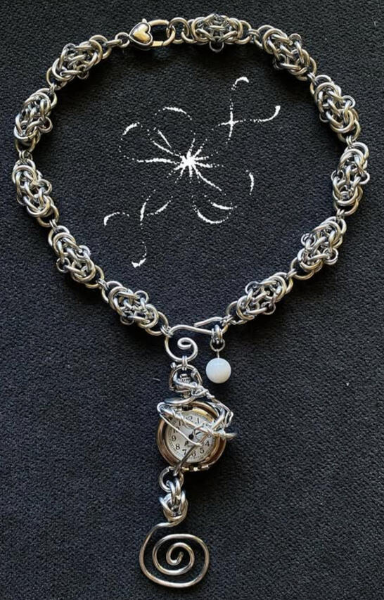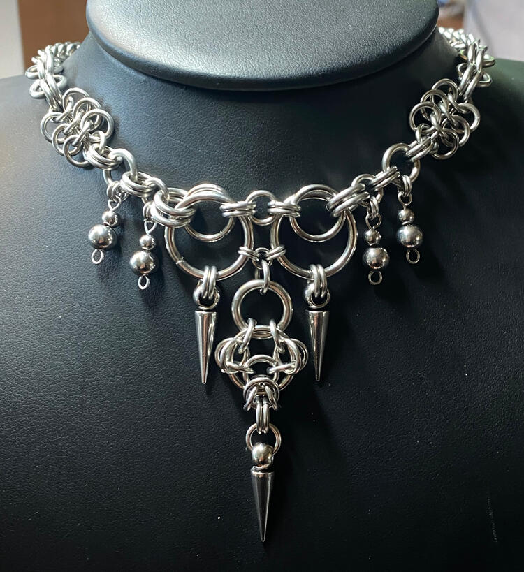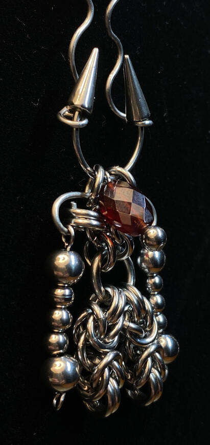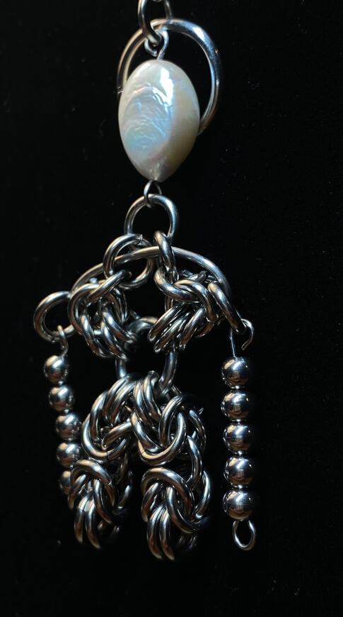 I make jewelry using stainless steel jump rings and chain mail techniques. I mainly make earrings and necklaces, although I occasionally make bracelets, bolo ties, and keychains as well.Typically I start by freehanding an abstract design, and then editing it or adding to it in order to make it symmetrical. This results in a creation process that has moments of freedom and intuition, as well as moments of methodical focus. I enjoy this way of working in almost every medium I do.In addition to stainless steel, I sometimes use pearls, stones, and crystal beads from my local jewelry supply shop.In the future I would like to incorporate silver casting into my work, as well as soldered pendants.